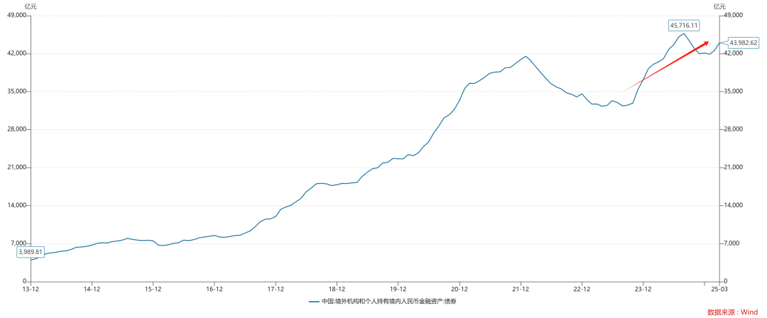 如上图所示,截至今年一季度末,外资持有境内人民币债券的规模约为4.4万亿人民币,人民币债券对外资保持了较高的吸引力。